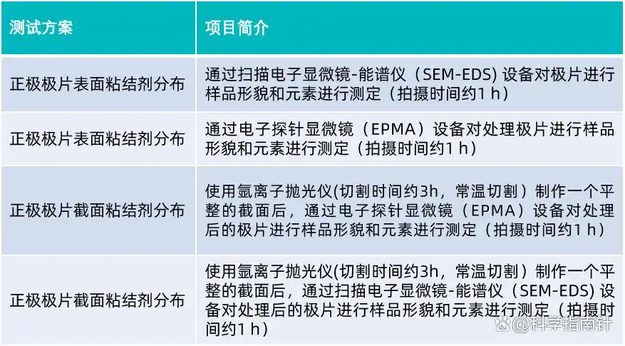 使用扫描电子显微镜技术(SEM-EDS)、电子探针显微镜(EPMA)对正极极片进行表面和截面测试,获取电池正极极片粘结剂的分布图;帮助研发人员分析材料的粘结剂是否均匀,从而提升极片的机械和电化学性能。