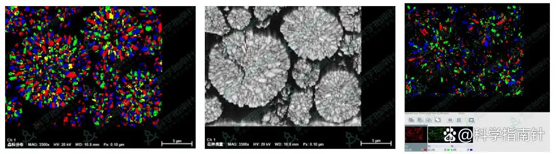 (从左至右:晶粒分布图、花样质量图、取向分布图)