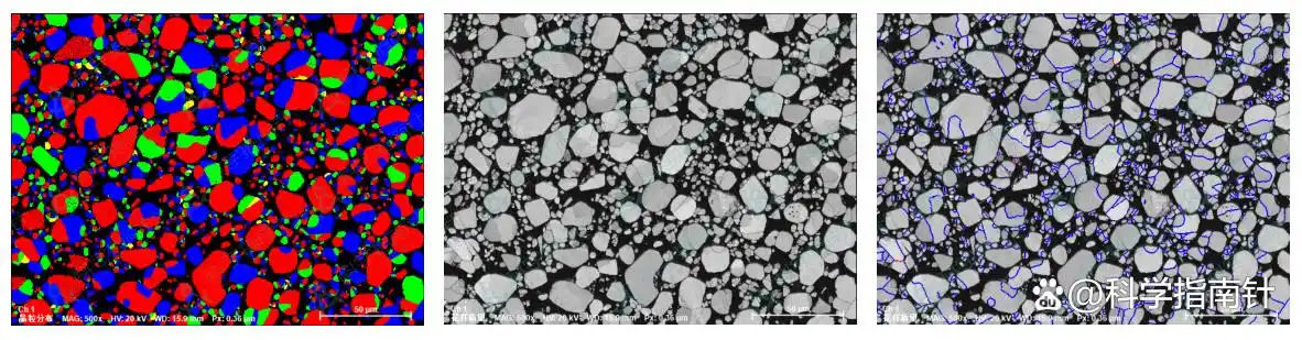 使用CP技术制备样品得到截面,再通过EBSD分析视场区域内颗粒的晶体结构,得到颗粒的结构类型、晶粒分布和晶界图等数据信息。使用channel 5数据处理软件,读取EBSD原始数据,并匹配额外添加的物相文件,得到物相分布和定量信息。
