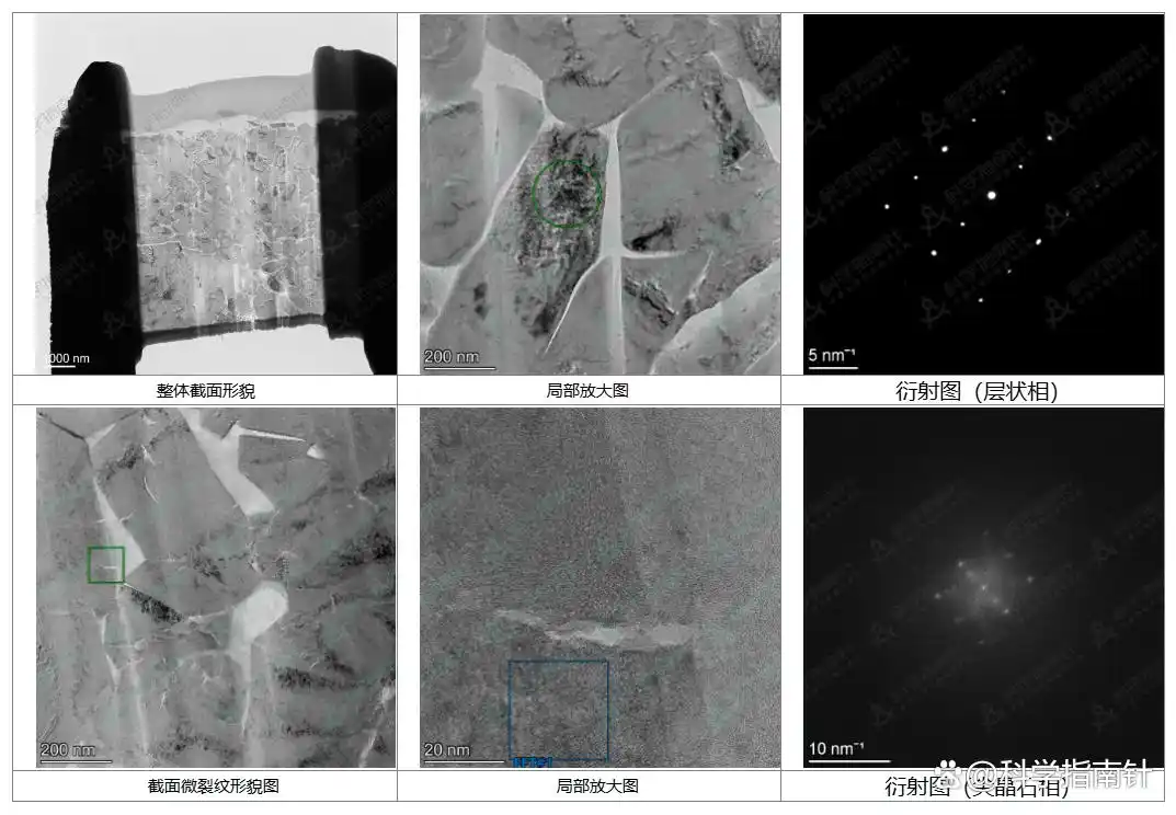 三元多晶材料在充放电过程中易出现晶界处应力积累,导致颗粒晶间产生裂纹,产生岩盐相,从而阻碍锂离子传递,降低材料结构稳定性,本项目利用聚焦离子束FIB,对材料样品做截面打薄制样,同时配合透射电子显微镜(TEM)完成对样品内部结构微观特征的观察和晶格、衍射分析,帮助研发人员了解三元正极中材料的相转变过程,从而为开发合适的三元正极材料提供指导。