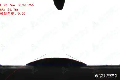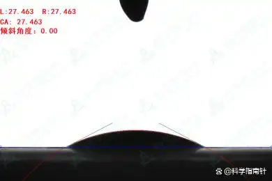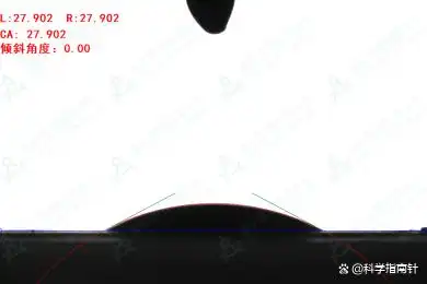 这表明液滴在固体表面的接触角为27.902°,且左右两侧的接触角一致,说明液滴对称性良好。倾斜角度为0.00°,说明测试是在水平状态下进行的,没有倾斜。