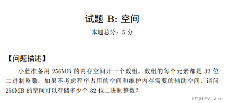 先将MB转换为字节Byte,也就是Byte(B),1MB = 1024KB, 1KB = 1024B,1B = 8bit(位)所以256 MB = 256 * 1024 * 1024B,32位二进制整数的存储空间也即32bit = 32 / 8 = 4B,所以可以存在 256 * 1024 * 1024 / 4,使用程序计算出结果为:67108864