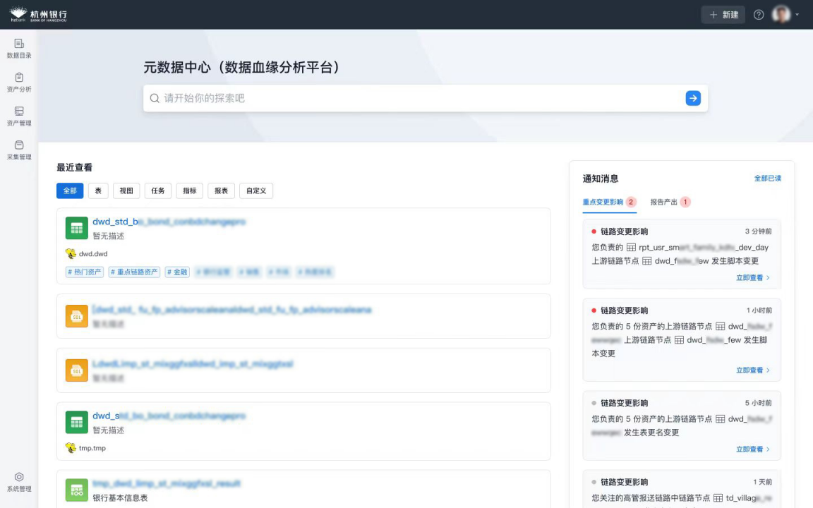 建设杭州银行全域数据资产知识图谱,覆盖杭州银行三类数据湖仓平台,纳管共计近百万张数据资产表,数十万个数据处理任务脚本,上百个分析应用,打通从“业务源 -> 交换同步平台 -> 大数据平台和多种数据仓库 -> 指标/报表/业务系统”的跨平台血缘链路。