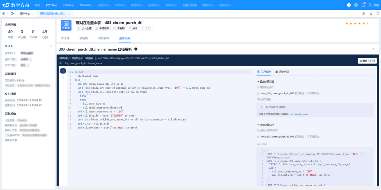 杭州银行数据资产管理平台日均访问量近 5000 次,资产详情页包含血缘模块,每日约一半用户会打开血缘页面。2024 年初,数据资产管理平台以 Aloudata BIG 的列算子血缘为底座,实现全域数据资产统一采集和连接,目前已经纳管数十万个元数据实体,包括 PostgreSQL、Hive、SparkSQL、Impala、Oracle、MySQL 等方言编写的 SQL 脚本、表和视图,端到端连通从业务源端数据库到应用端报表的列算子血缘图谱。