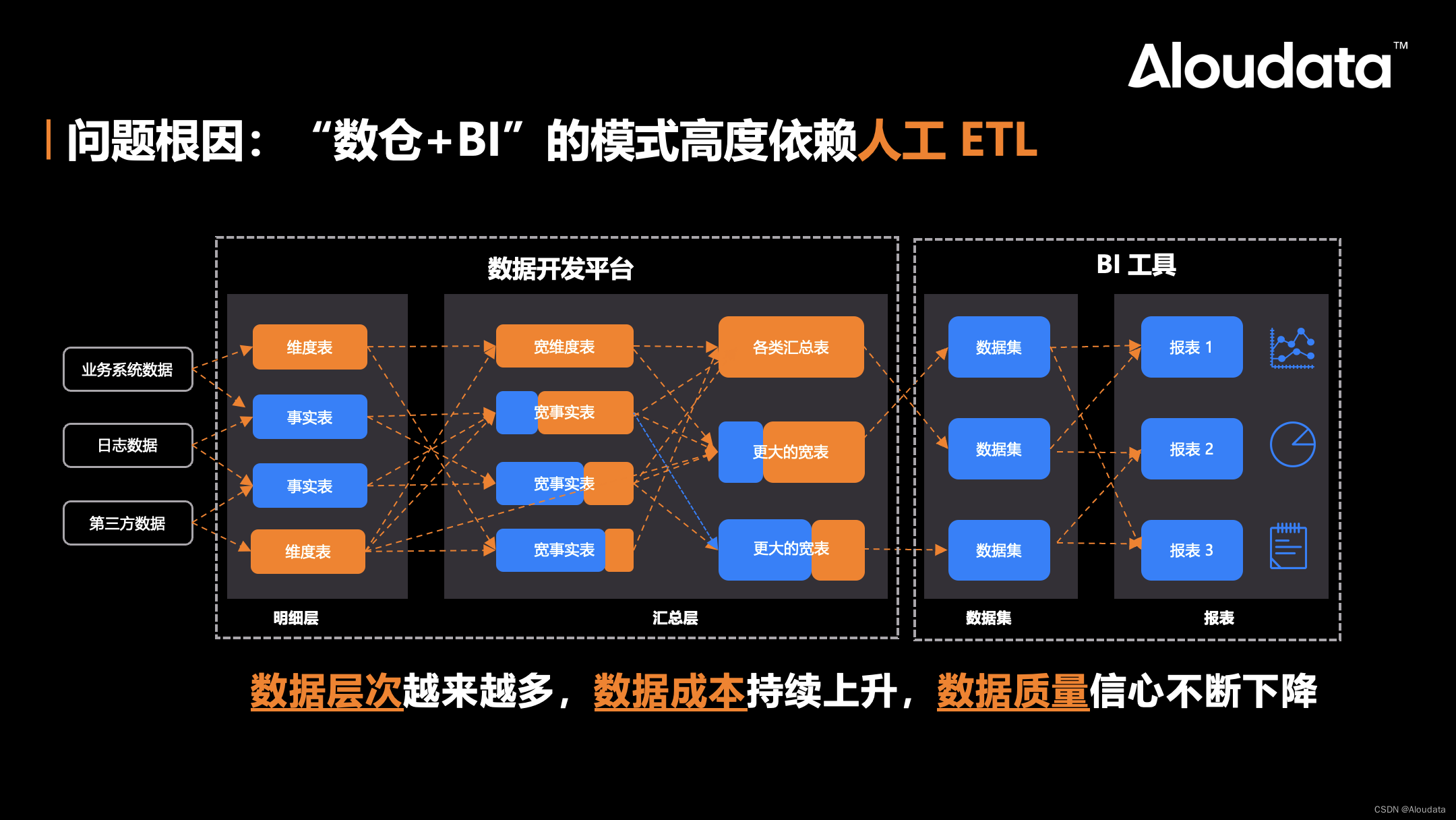“贵”体现在数据存储和计算成本的不断上升,以及数据开发人员的不断增加,原因在于随着分析需求的数量和紧迫性增加,数据重复加工,缺乏有效的数据治理。