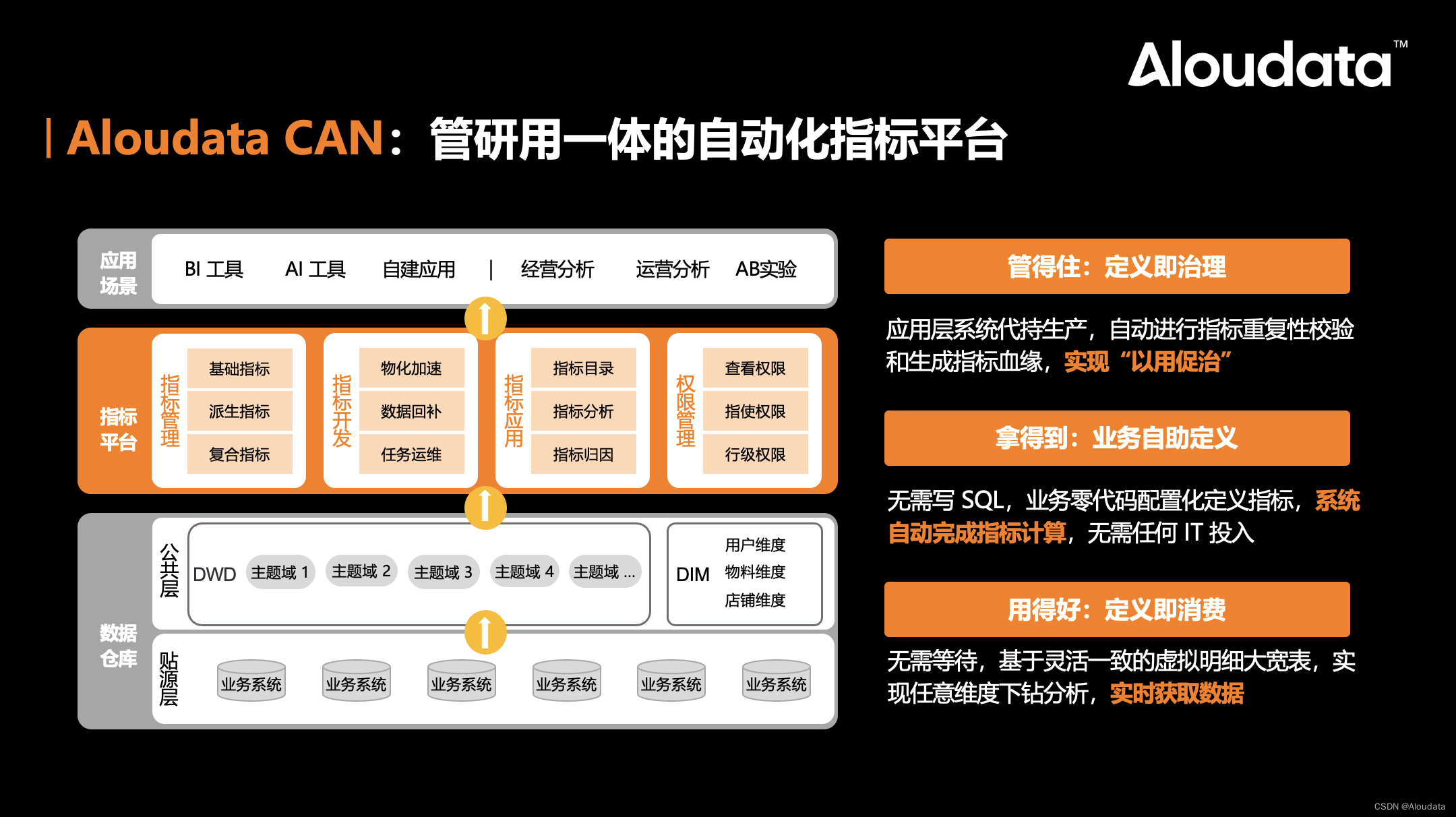 Aloudata CAN 自动化指标平台,作为一种创新性的以指标为中心的数据生产模式,成功地打破了传统数据处理与业务应用之间的壁垒,将开发价值与业务价值紧密地衔接在一起,让原本需要繁重的人工开发才能被应用的数据,焕发出新的生命力,实现了数据分析“快、全、准、省”的四大目标。