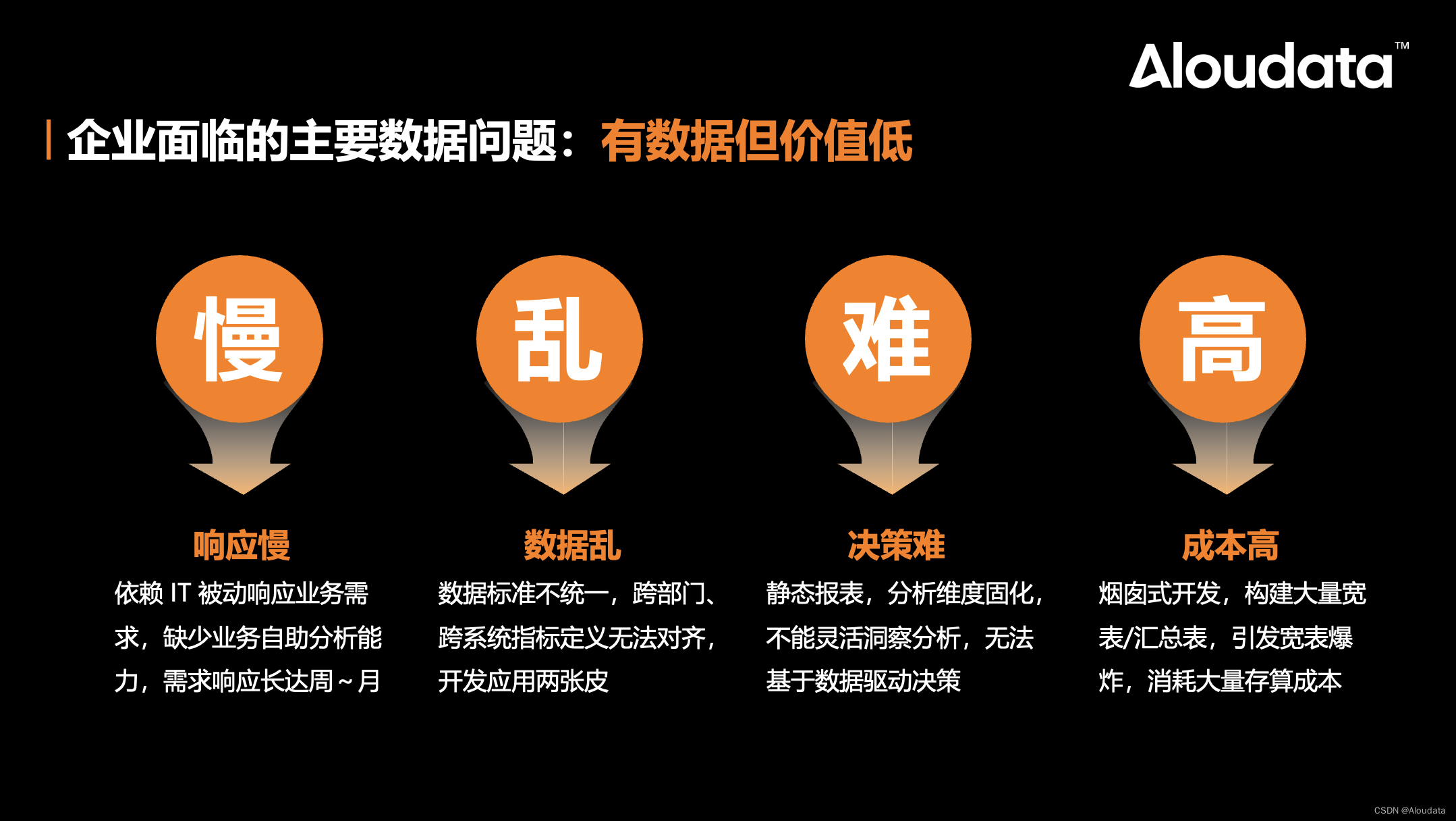数据问题主要表现为数据分析的“慢、缺、乱、贵”。