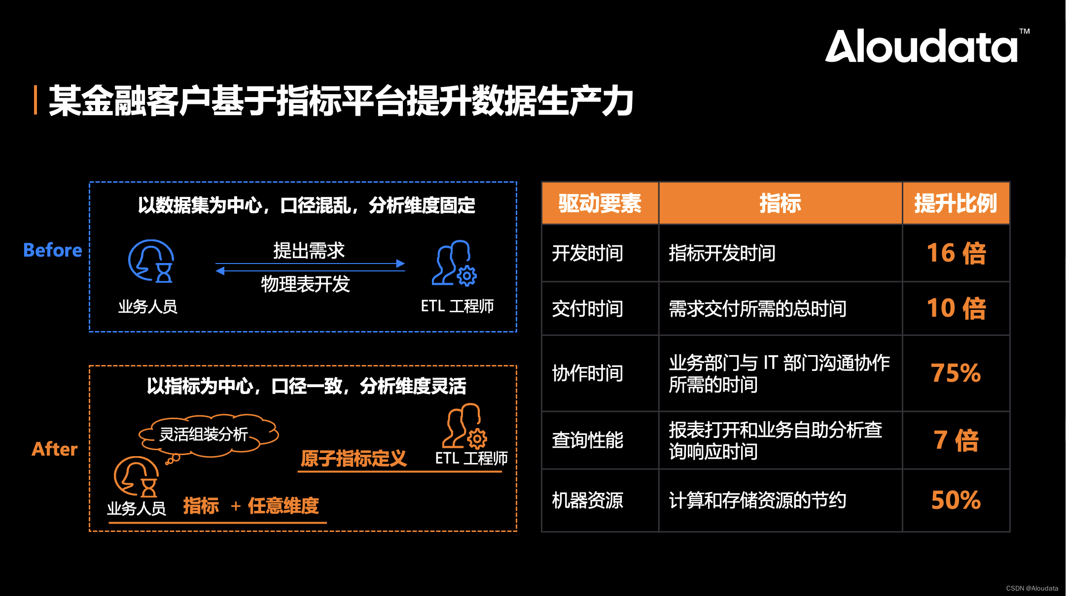 Aloudata CAN 的引入,使得业务部门能够直接从平台中获取所需数据。这一变革不仅大大缩短了数据决策的周期,从原本的月级别缩短到现在的分钟级、小时级,还显著提升了数据开发的效率。由于 Aloudata CAN 采用 NoETL 自动开发技术,业务部门只需表达其业务逻辑,即可实现指标的定义与开发,开发效率提升 16 倍以上。