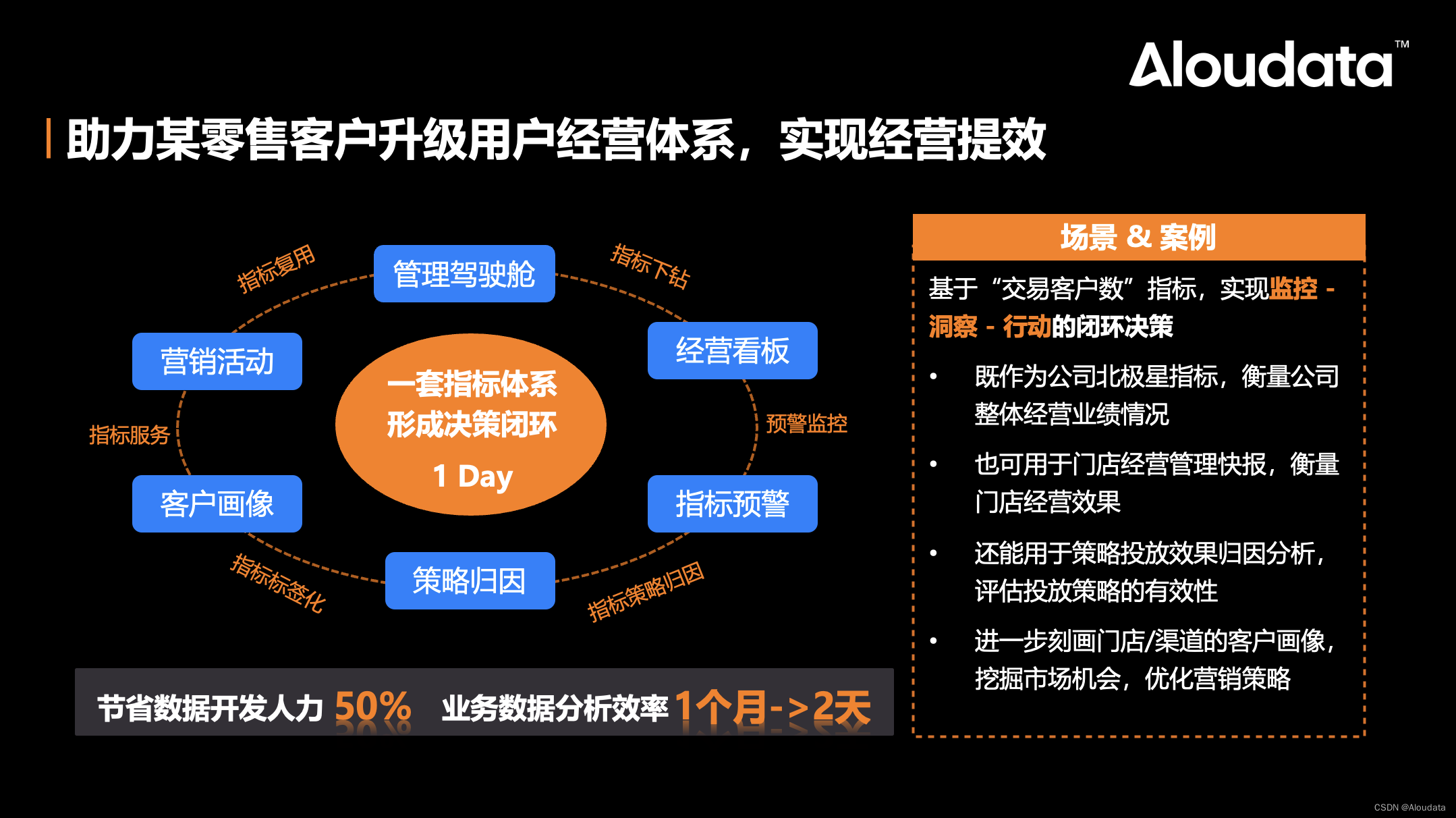 在该零售客户的实践中,Aloudata CAN 的应用显著缩短了策略从上线到效果评估再到调优的整个周期。原本需要一个月的时间现在仅需两天即可完成。更重要的是,整个闭环过程完全由业务部门自主完成,无需 IT 部门的介入,大大提高了业务决策的效率和自主性。