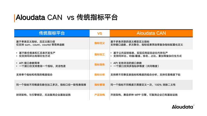 相比之下,第三代指标平台,以 Aloudata CAN 自动化指标平台为例,它不仅实现了“管研用一体化”,更在指标定义、开发、应用及智能化方面取得了显著提升。通过明细语义数据模型定义指标,支持复杂指标的配置化定义和自动化开发,同时提供丰富的 API 接口和灵活的参数配置,满足各种业务需求。