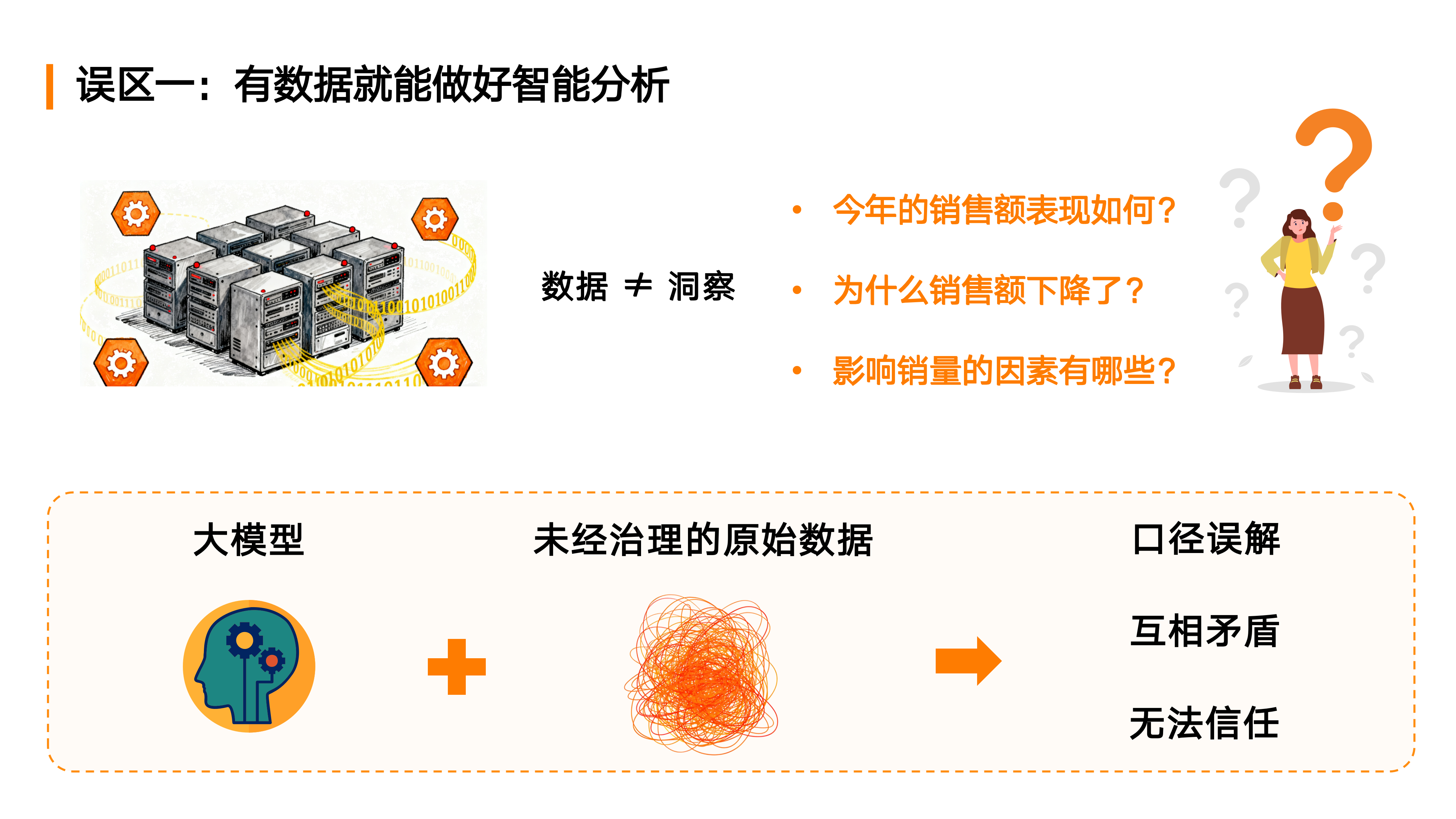 然而,在这条通往智能化的道路上,许多先行企业都陷入了一些误区,导致落地后“问不准”、“问不全”、“问不深”,进而难以真正推广。那么企业级智能数据分析有哪些误区?采用怎样的技术方案才能让 Data Agent 不再是空中楼阁,而是真正可信且智能的业务伙伴呢?本文将给出 Aloudata 的答案。