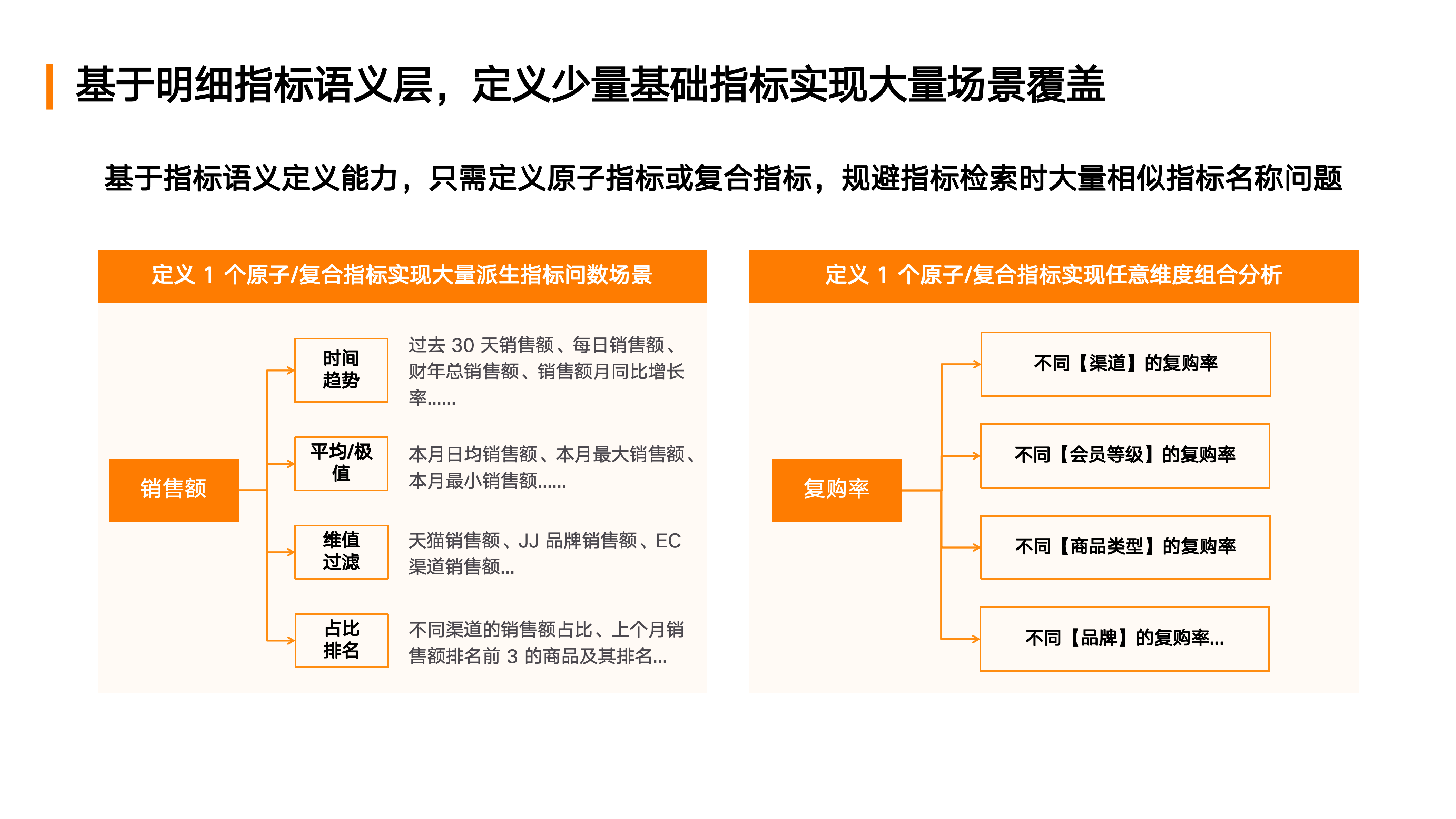 上层基于语义模型构建指标(基础指标、派生指标和复合指标)和维度。