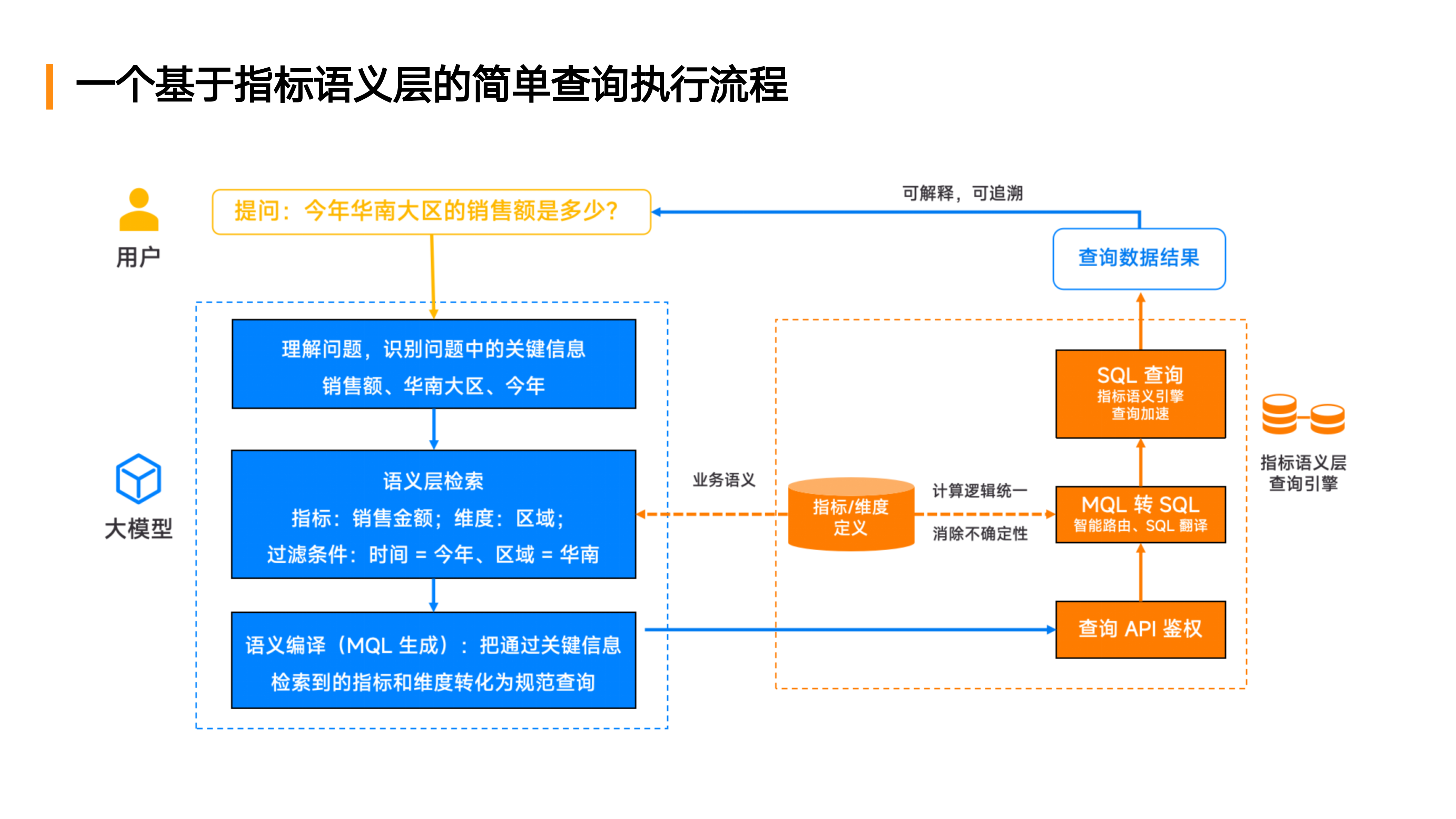从整个执行流程可见,我们将灵活的语义解析交由大模型处理,把需要精确执行的任务交给语义查询引擎,让二者各司其职,发挥各自优势,最终达成用户期望的查询效果,这就是基于指标语义层完成智能问数的逻辑。