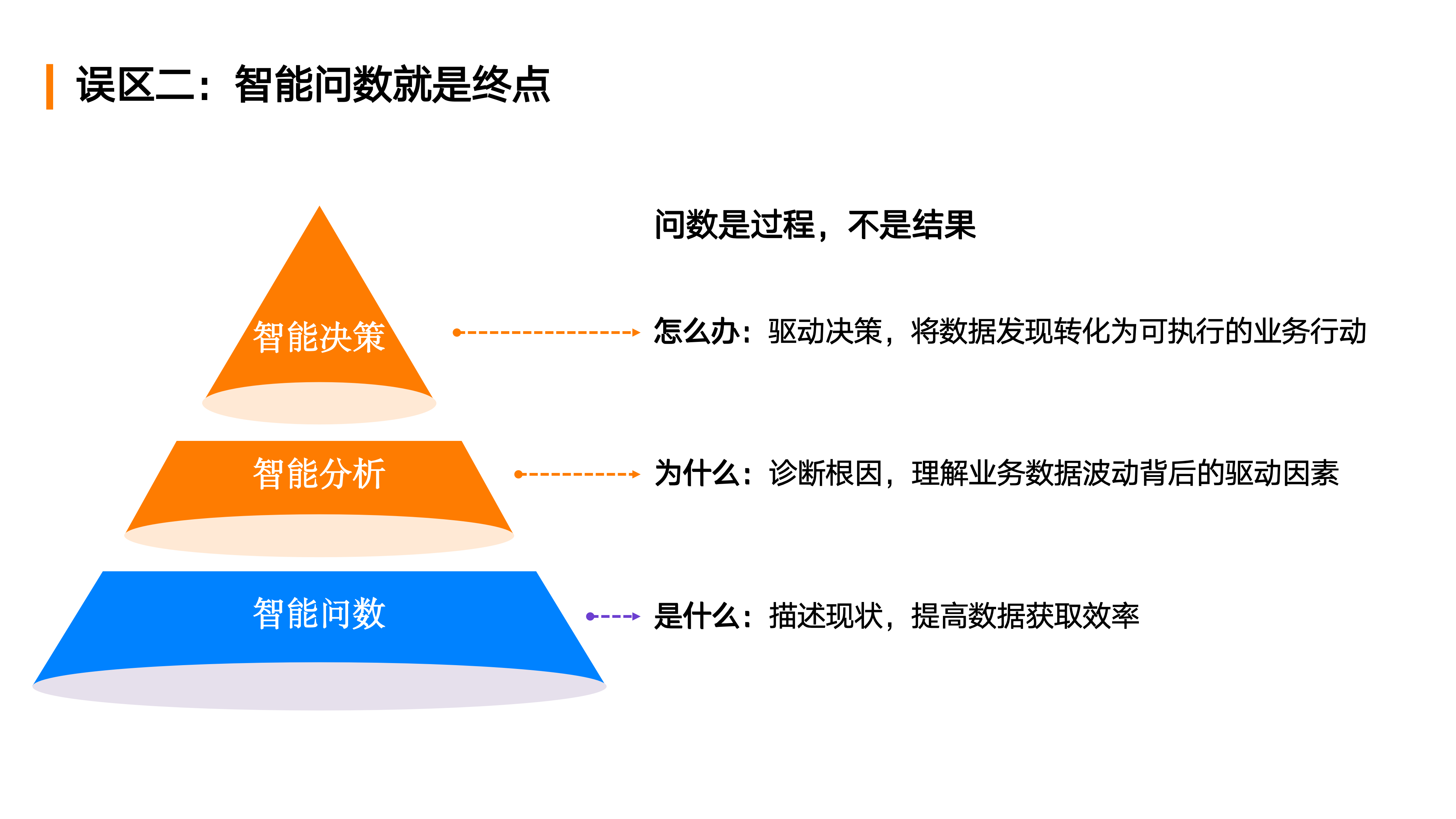 市场上众多产品将智能问数视为终极目标,但真实业务场景中的数据需求远不止于此。完整的分析价值链应当包含:从数据获取开始,延伸到趋势观察、波动归因、影响因素分析,最终落地到行动决策。智能问数仅仅是这个链条的起点。如果产品只解决"问数"环节,只回答“是什么”,而不能进一步回答“为什么”和“怎么办”,就如同只提供了开采工具却缺少精炼设备,无法将原始数据转化为真正的业务价值。
