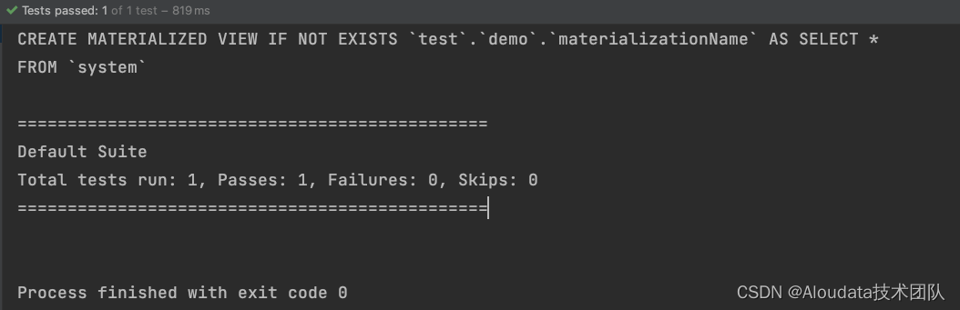 @Testpublic void test() throws SqlParseException {String sql = "CREATE MATERIALIZED VIEW IF NOT EXISTS \"test\".\"demo\".\"materializationName\" AS SELECT * FROM \"system\"";SqlParser.Config myConfig = SqlParser.config().withQuoting(Quoting.DOUBLE_QUOTE).withQuotedCasing(Casing.UNCHANGED).withParserFactory(DemoSqlParserImpl.FACTORY);SqlParser parser = SqlParser.create(sql, myConfig);SqlNode sqlNode = parser.parseQuery();assertTrue(sqlNode instanceof CreateMaterializedView);System.out.println(sqlNode);}