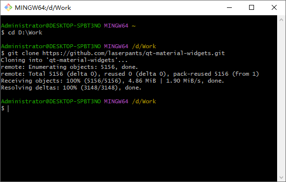 命令行执行git clone https://github.com/laserpants/qt-material-widgets.git下载工程,如下图所示