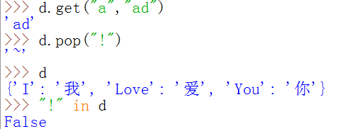 - d.pop( key, default ) 取出字典d中键key对应的值。若键key不存在于字典中,则返回规定的 default 值。default值可缺失。取出后,该键值对会从字典d中消失