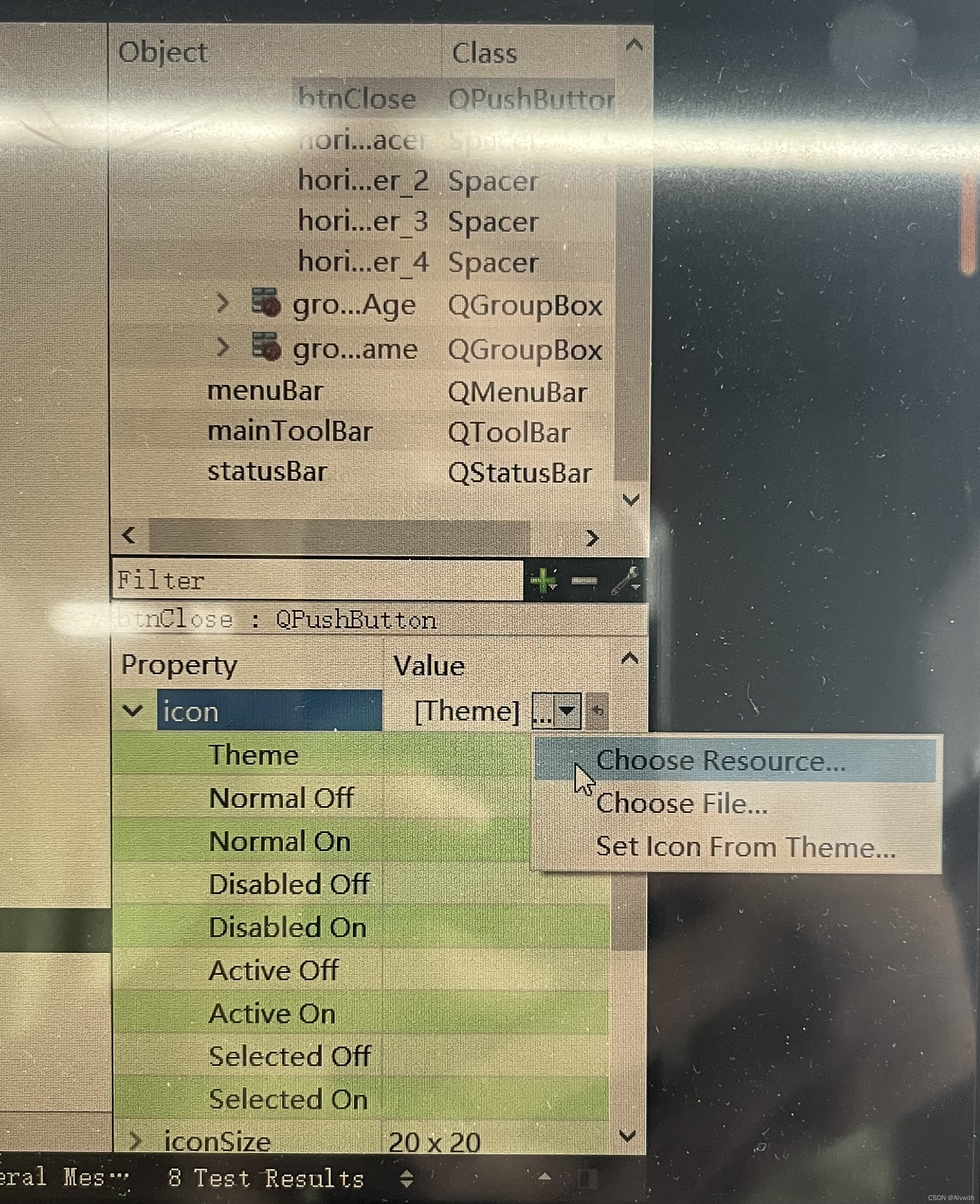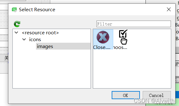 ui窗体设计界面---->关闭按钮的属性编辑器(右下角)----->QAbstractButton----->icon----->choose resource
