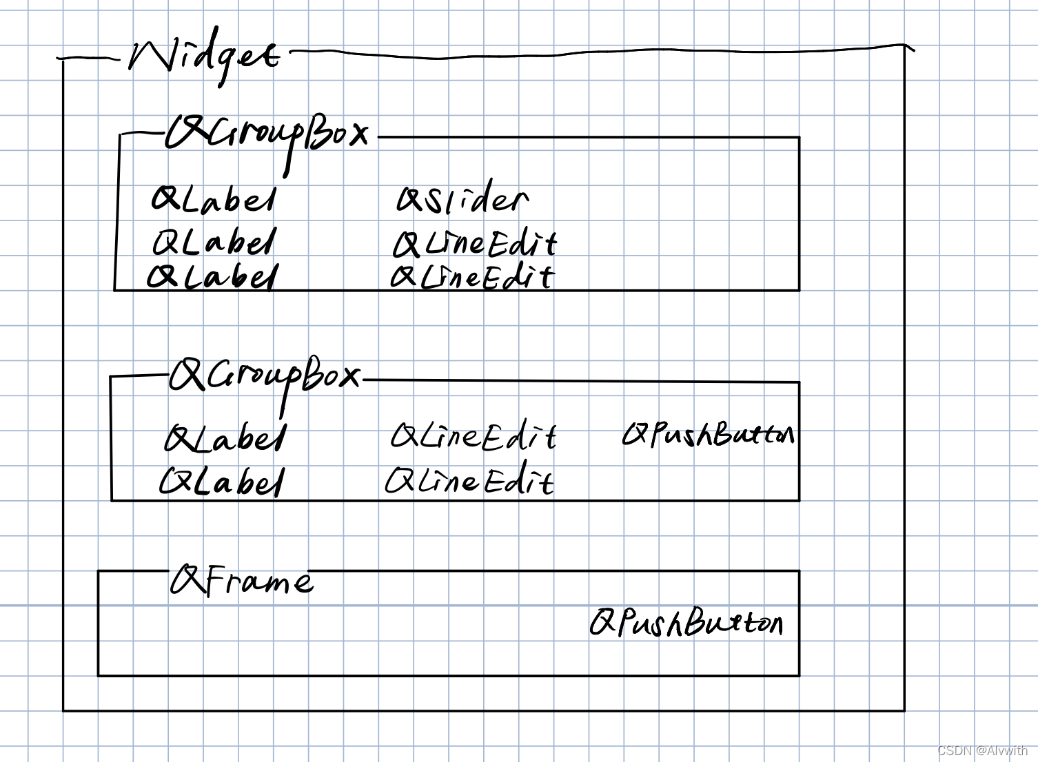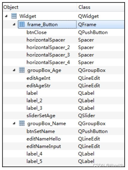 窗体上组件的层次关系、objectName及其所属类: