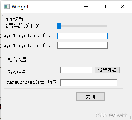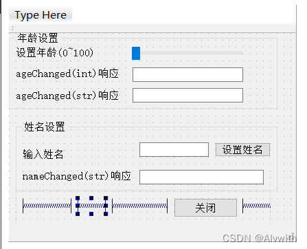 拖动蓝色滑块,ageChanged(int)响应中会显示对应年龄,ageChanged(str)响应中会显示对应年龄的对应句子(“你是xxx”)。输入姓名后点击设置姓名,nameChanged(str)响应中会显示“Hello,xxx”