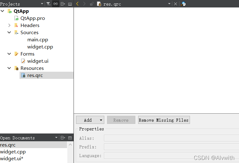 右键res.qrc----->open in editor(打开资源文件编辑器)
