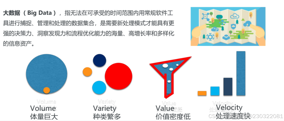 大数据具有规模大、种类多、速度快、价值密度低等特点。规模大意味着数据量庞大,可能达到 TB、PB 甚至 EB 级别。种类多则涵盖了结构化、半结构化和非结构化数据,如文本、图像、音频、视频等。速度快体现在数据的产生和处理速度非常快,需要实时或近实时的处理能力。而价值密度低是指在大量的数据中,有价值的信息相对较少,需要通过有效的分析手段才能提取出有价值的内容。
