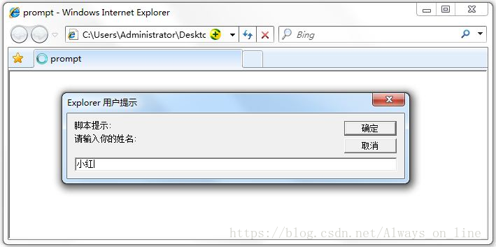 prompt弹出消息对话框,通常用于询问一些需要与用户交互的信息。弹出消息对话框(包含一个确定按钮、取消按钮与一个文本输入框)。
