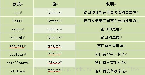URL:可选参数,在窗口中要显示网页的网址或路径。如果省略这个参数,或者它的值是空字符串,那么窗口就不显示任何文档。 窗口名称:可选参数,被打开窗口的名称。 1.该名称由字母、数字和下划线字符组成。 2."_top"、"_blank"、"_self"具有特殊意义的名称。 _blank:在新窗口显示目标网页 _self:在当前窗口显示目标网页 _top:框架网页中在上部窗口中显示目标网页 3.相同 name 的窗口只能创建一个,要想创建多个窗口则 name 不能相同。 4.name 不能包含有空格。 参数字符串:可选参数,设置窗口参数,各参数用逗号隔开。