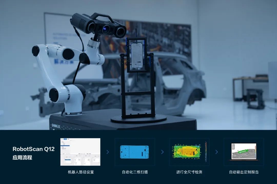 面对制造业规模化生产需求,OptimScan Q12支持与RobotScan 机器人智能3D检测系统集成,通过预设检测程序,设备完成自动扫描、自动检测、输出报告的一系列全流程应用,从而实现全自动、批量化全尺寸检测。