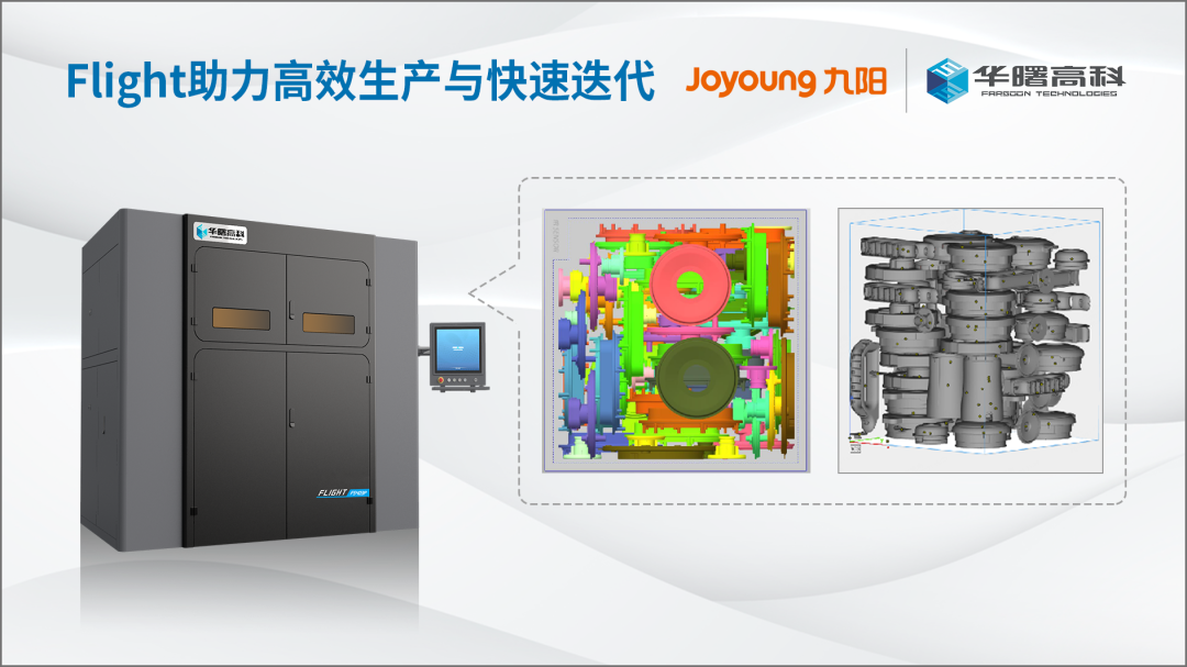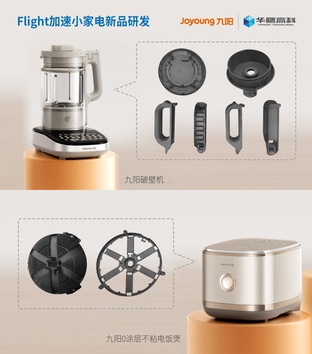 Flight可实现设计快速迭代与小批量试制,将手板加工周期从传统工艺的3-5天缩短至1-2天,效率提升60%,整个研发周期提升20%。例如,九阳使用Flight技术生产新品0涂层电饭煲及破壁机等手板件,可在48小时内完成整机零件打印,快速支持装配验证和功能测试(如强度、耐温性等),显著提升研发灵活性与市场响应速度,构建了竞争壁垒。