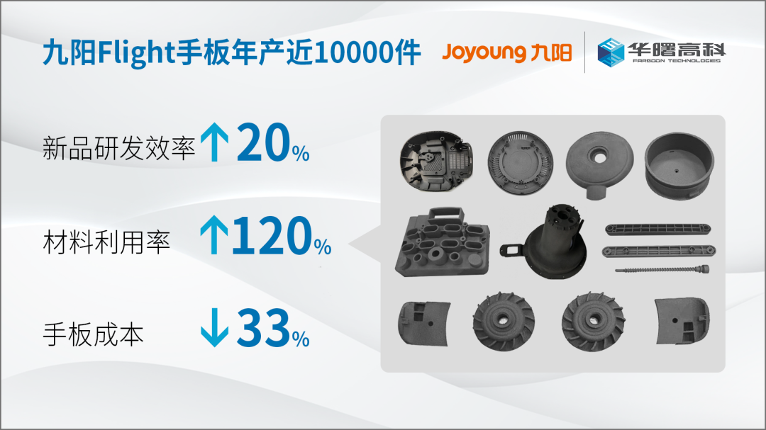 在小家电行业“内卷化”加剧的背景下,3D打印技术已深度融入九阳小家电新品研发过程中。据九阳小家电研发工坊吴闯经理介绍,2024年,九阳通过华曙高科Flight 403P设备完成近10000件手板制作,使用材料超1吨,涵盖功能验证、市场测试、3C认证等关键环节。相较于传统CNC工艺,Flight技术使新品研发效率提升20%,为九阳小家电新品快速上市提供助力,抢占市场先机。