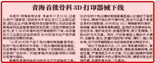 7月10日,天域(青海)科技创新有限公司获得青海省首个3D打印骨科医疗器械注册证书,多个3D打印骨科医疗器械顺利下线。据报道,这是青海首个3D打印骨科医疗器械注册证书,该公司3D打印产品个性化增材制造截骨导板、医用个性化骨科手术导板、个性化增材制造骨模型,已在青海大学附属医院、青海红十字医院投入使用,并获得广泛好评。