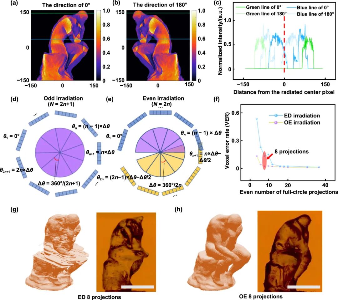 这项突破的关键在于一种名为奇偶(OE)辐照的全新投影策略。传统方法采用等间距投影,通常会收集重叠信息。相比之下,新方法会调整角度减少重复,使每个投影更有意义。模拟结果表明,这不仅提高了打印精度,还提高了流程效率,尤其是在使用较少投影的情况下。