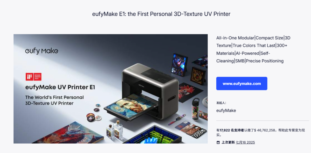 而安克近期推出的首款面向消费市场的3D纹理UV打印机E1,以4676万美元的众筹金额刷新平台有史以来全品类最高众筹记录。安克创新作为“跨境电商一哥”,在充电类产品、智能家居、便携影像等板块都已经有了深厚的技术积累及市场沉淀,在2022年正式进军3D打印市场。