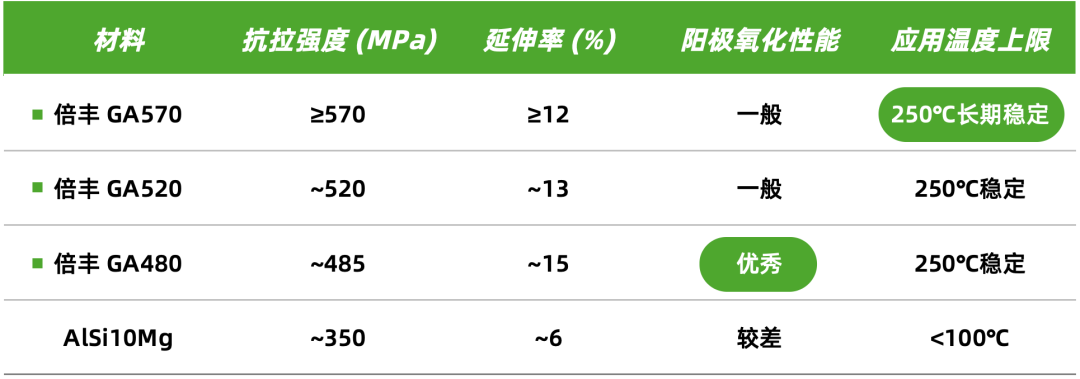 其中GA480在保有强度优势的同时,特别优化了阳极氧化性能,可呈现细腻均匀的金属质感表面,成为对外观品质要求较高产品的理想选材。三款材料均具备良好的打印适配性和简化热处理工艺,支持复杂构件的高效制造和大规模工程化应用。