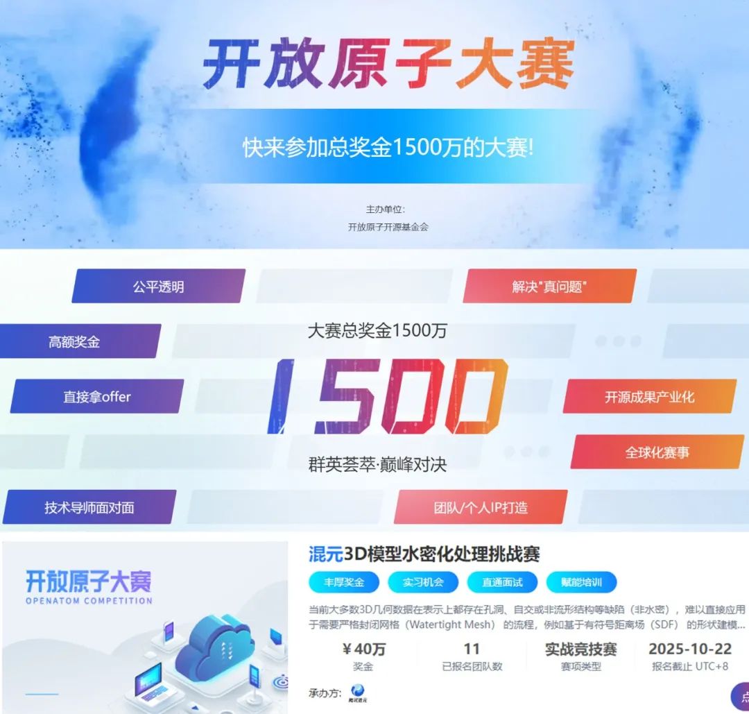 该大赛创办于2023年,每年举办一届,是中国首个国家级开源赛事。大赛面向开源组织、企事业单位、高等院校、科研院所等机构征集一批产业发展、科研创新过程中遇到的技术难题,联合社会各界鼓励通过开源模式解决“真问题”、推广开源技术、发现开源人才,本届大赛总奖金达1500万。