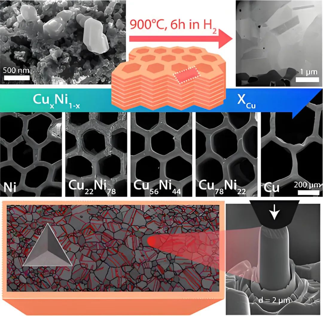 在这项工作中,研究人员探索了铜镍合金中合金成分对材料微观结构和力学性能的影响,得到了一种尤为突出的材料配方——Cu12Ni88,它的强度几乎是Cu59Ni41合金的四倍。