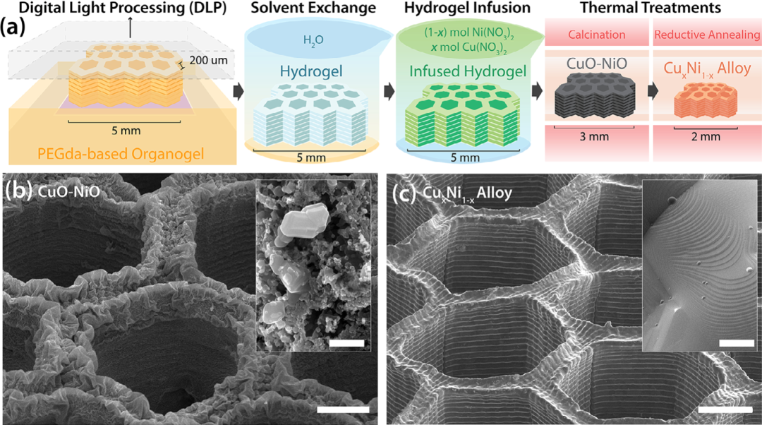 接下来,充满金属离子的水凝胶支架将在空气中煅烧为金属氧化物,随后在N₂-H₂气氛中中进行还原,得到设计结构的金属或合金部件。在整个过程中,部件的形状得以保持,但会有60%到70%的线性收缩,同时在煅烧过程中大约会有65%到90%的质量损失。