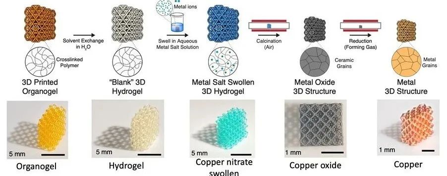 经查询,这是一种微尺度打印方法,相关技术在2022年就被发表在nature正刊上面。3D打印技术参考回顾这则研究发现,该工艺首先使用SLA或DLP技术3D打印水凝胶支架,然后将该支架浸泡在液态金属盐溶液中,金属离子随之进入到水凝胶支架中。