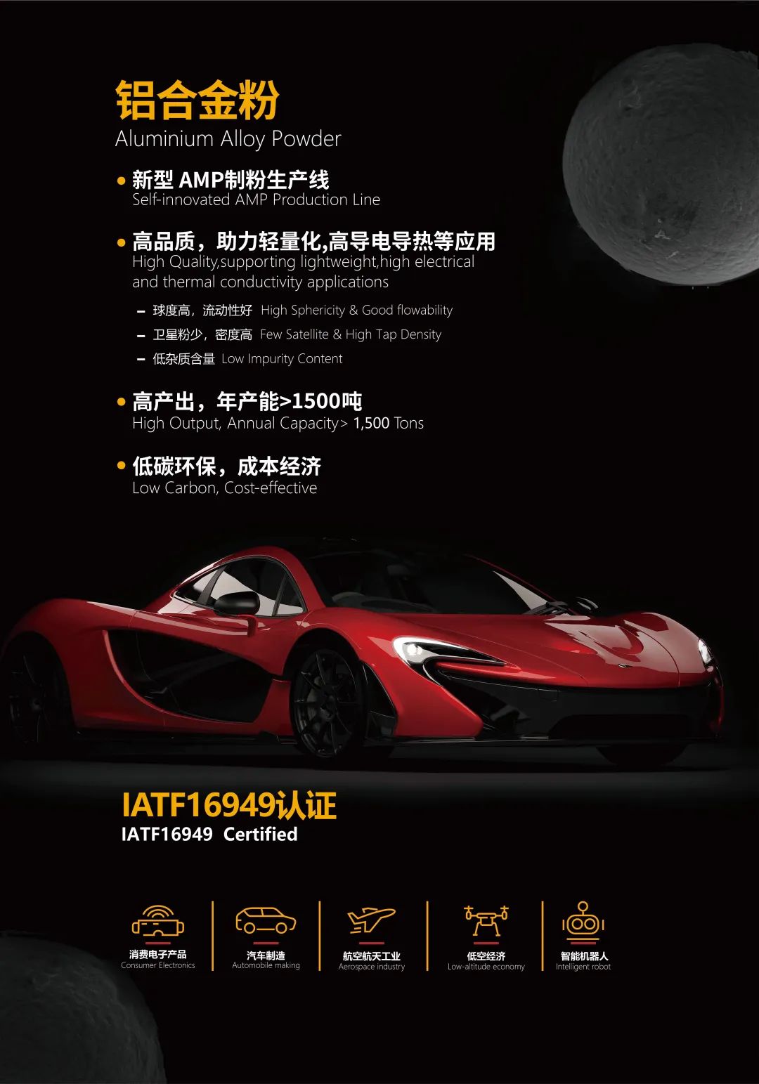 值得一提的是,新投产的1500吨铝合金粉产线,依托自主研发的AMP(先进雾化工艺)生产线,实现了粉末品质和生产效率的双重飞跃。关键指标亮眼:高球形度≥92%、低氧含量≤350ppm、松装密度≥1.4g/cm³,卫星粉少、流动性好,适配主流设备,获海内外客户广泛认可。产品线覆盖多元需求: