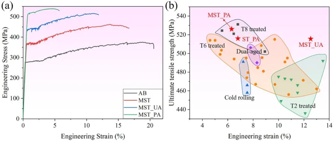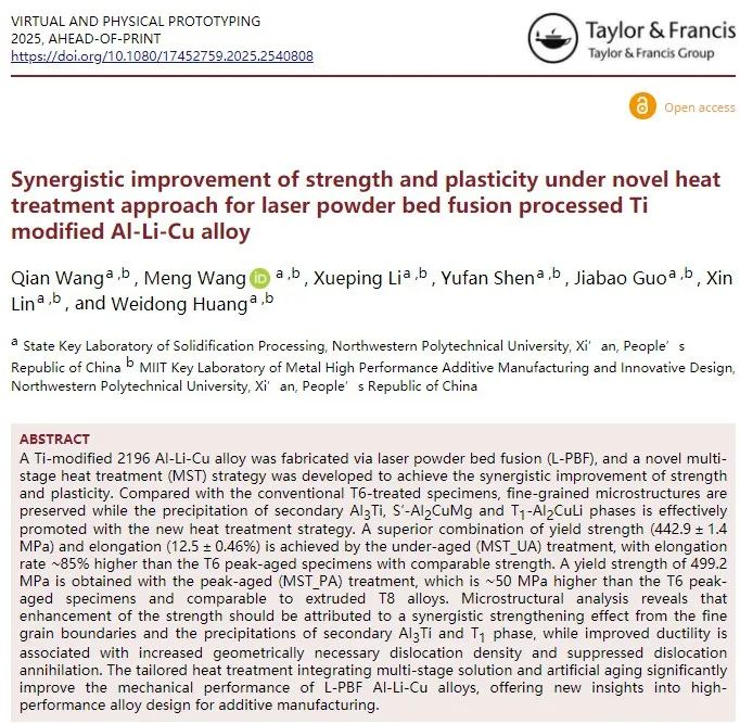 研究发现新型MST策略能有效抑制晶粒粗化,保留细晶粒,并促进次生Al₃Ti和S′/T₁相协同沉淀。研究突破了铝锂铜合金强度与塑性的匹配难题:在MST欠时效状态下,实现了高强度(515.7MPa)与高延伸率(12.53%)的优异组合;在MST峰值时效状态下,获得了526.2MPa的超高强度,同时保持良好塑性。该工艺为增材制造高性能铝合金的热处理提供了新框架,能够有力推动其航空航天应用。该研究形成成果“Synergistic improvement of strength and plasticity under novel heat treatment approach for laser powder bed fusion processed Ti modified Al-Li-Cu alloy”,发表于工程技术领域权威期刊Virtual and Physical Prototyping。目前,该期刊的影响因子为10.2。本文的通讯作者为王猛教授(博士生导师),其长期从事金属增材制造技术研究,核心专利"成分及组织可控的激光立体成形方法"获中国发明专利奖优秀奖。