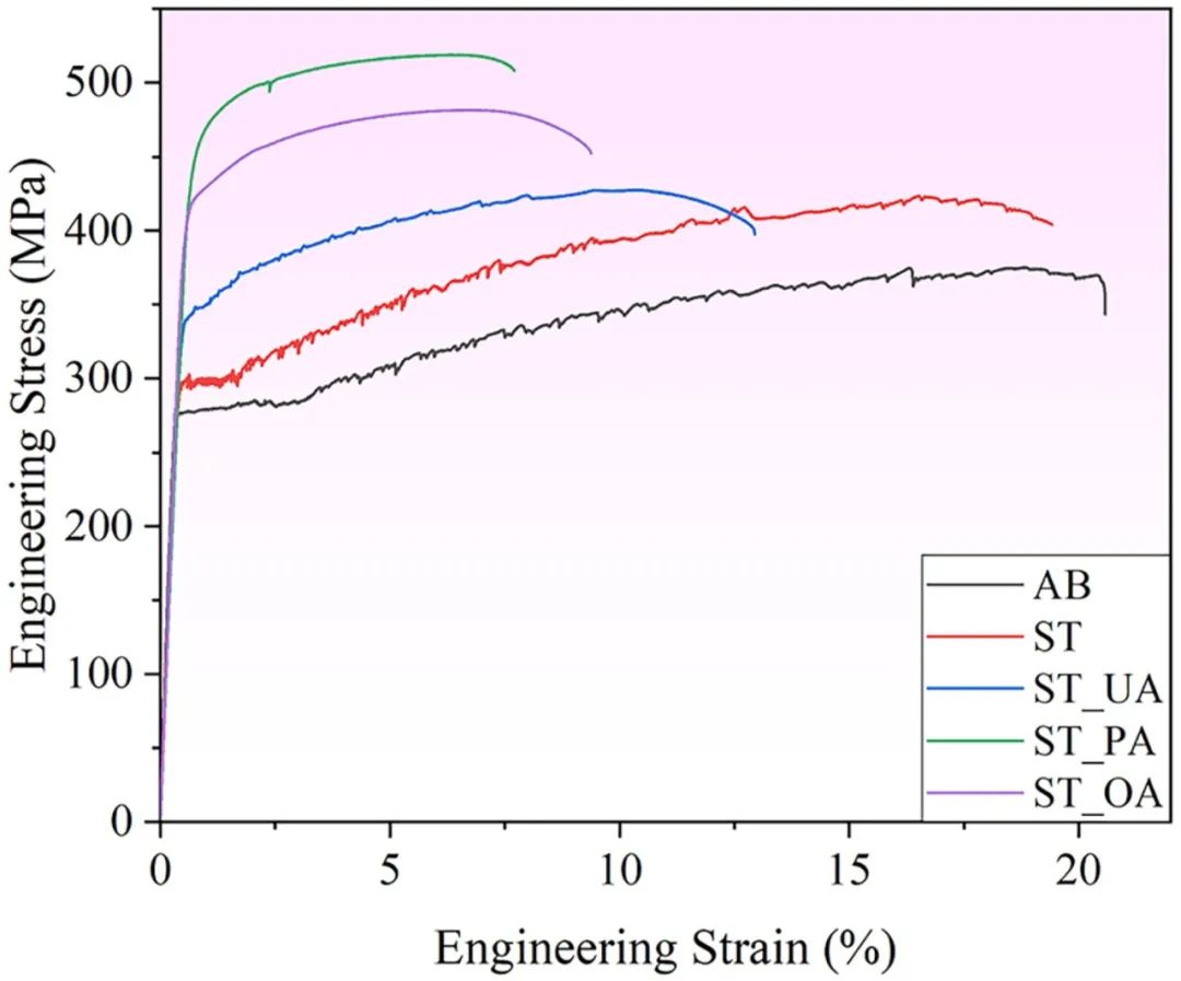 L-PBF Ti改性Al-Li-Cu合金在常规T6处理下的工程应力-应变曲线