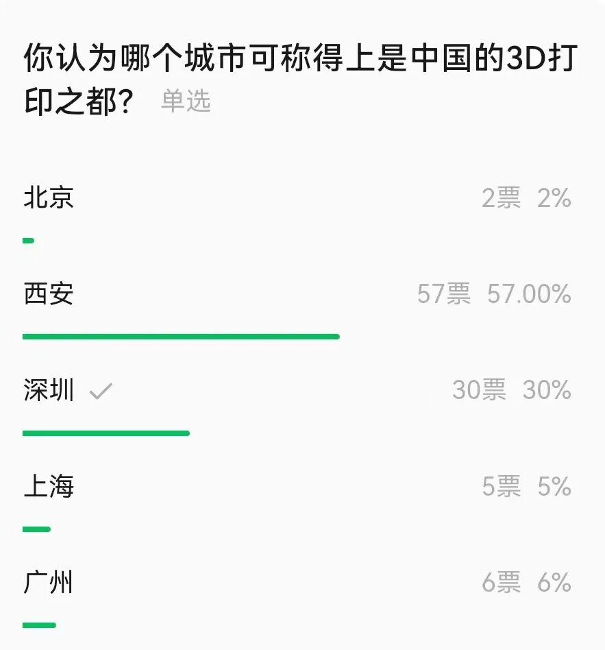 昨日互动结果出炉,西安被超过50%的行业人员认为是中国的3D打印之都。