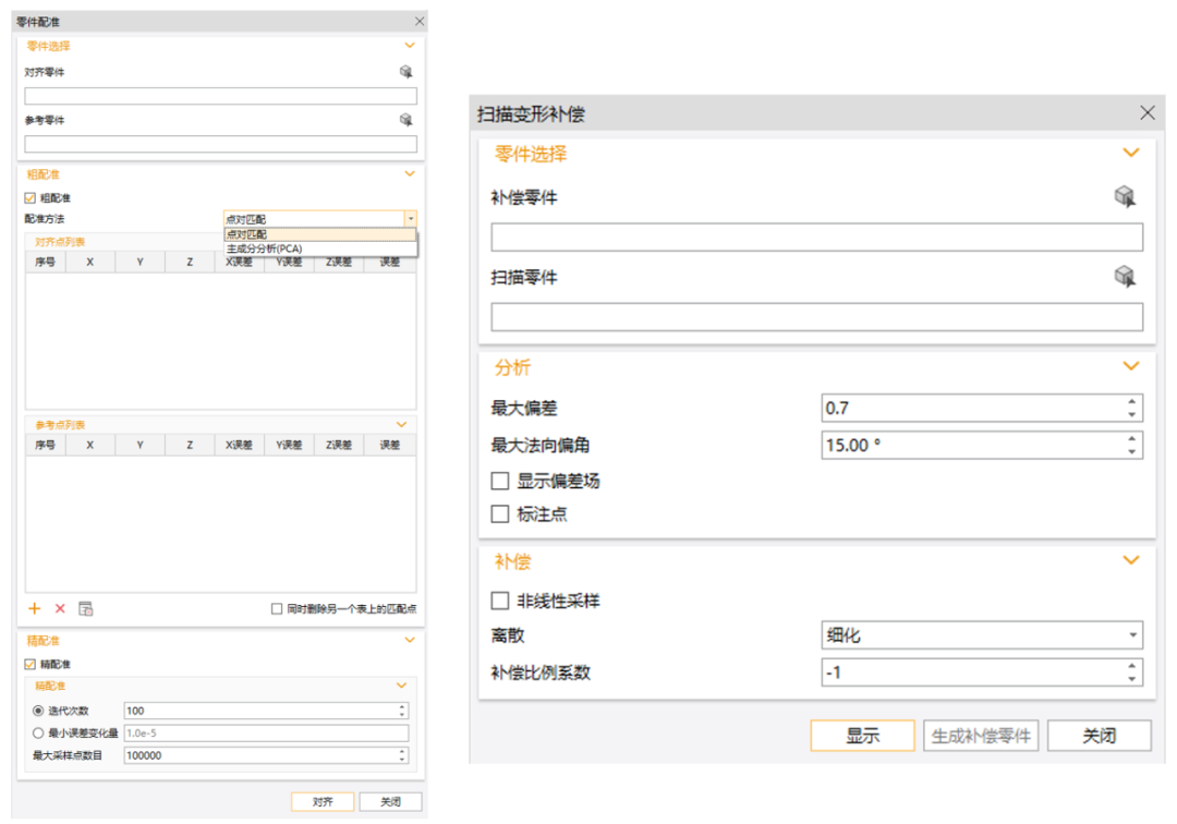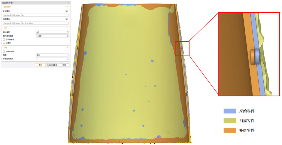 在VDE软件中启动“生成补偿零件”功能,系统自动计算得到零件变形场,并将其反向应用于原始模型。用户可根据需求调整补偿系数(默认值为1),得到经过精确逆向预变形的补偿模型。