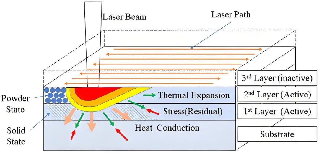 LPBF过程涉及高能量激光输入、金属粉末的热性能以及打印过程中热量如何消散的相互作用。根据工艺参数的不同,激光扫描粉末后会产生一个大约为50至150微米宽、10至50微米深的熔池,同时,热影响区会延伸数倍于熔池的大小,对已经凝固的粉末层造成影响。当激光扫描方向不变或周期性重复时,激光熔融产生的热应力容易沿着固定方向发生积聚,导致不规则的融合甚至是孔隙等缺陷。