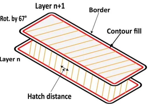 对于LPBF来说,素数‘67’作为旋转角度是非常合适的,因为它无法被360°整除,这意味着实际打印过程中需要经过非常多的层数才会出现重复。具体来说,67°的数学优势在于它有效地避免了周期性重复,不同于其他角度(如30°、45°、60°或90°),67°可以确保激光能量在所有方向上近似随机分布,进而促进温度场均匀分布,这样可以有效地防止打印过程中激光熔融产生的热效应沿着固定方向积聚,有利于形成具有各向同性微观结构的3D打印部件。