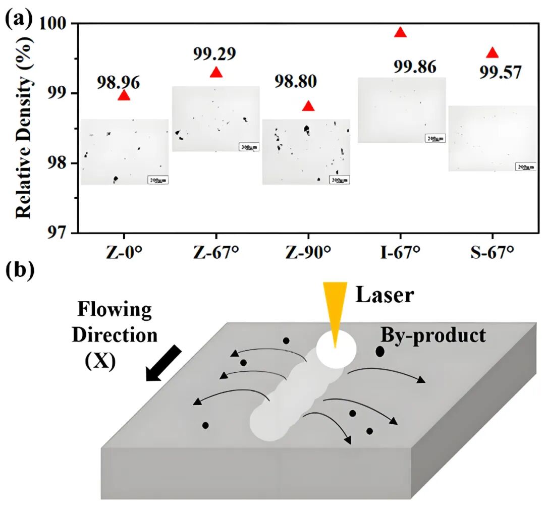 不同扫描策略下样品的相对密度;( b )扫描方向与保护气体流动方向平行的示意图。(来自华南理工大学相关研究)