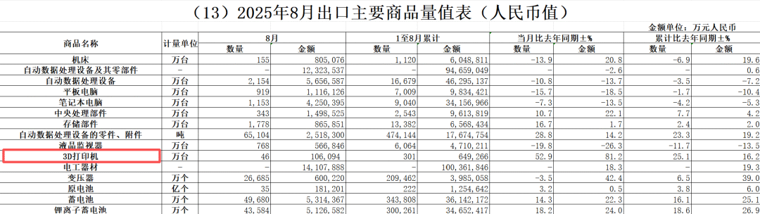 海关总署发布最新数据显示,2025年8月我国3D打印机出口量达到46万台,同比增长52.9%,出口总额为10.6亿元,同比增长81.2%。1至8月累计出口301万台,同比增长25.1%,累计出口总额为64.9亿元,同比增长16.2%。