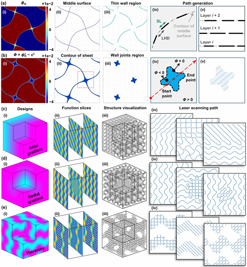 点阵的路径生成示意图:(a)从函数生成轮廓/单道路径;(b)从函数生成悬垂区域的旋转路径;(c-e)梯度或多层级点阵结构的参数场分布、函数切片及扫描路径等。