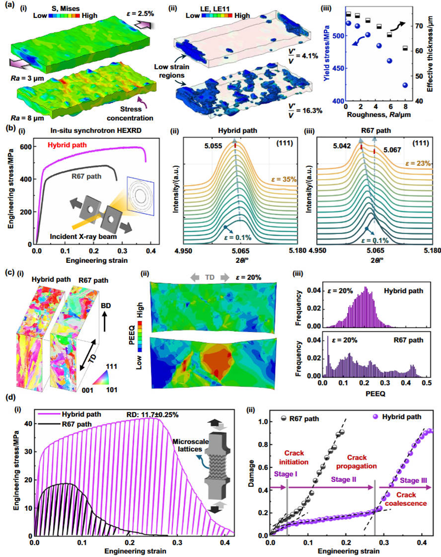 图4. 薄壁及点阵结构的力学响应:(a)粗糙度的影响;(b)原位同步辐射下揭示薄壁的变形行为;(c) 薄壁结构的晶粒尺寸及取向分布及晶体塑性仿真;(d) 点阵结构在循环加载下的力学响应及损伤演变。